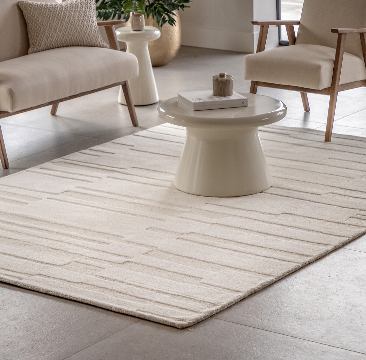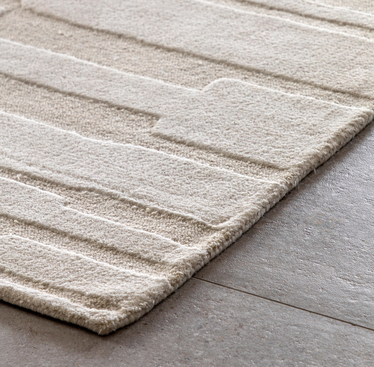 A modern minimalist geometric area rug in neutral tones, featuring subtle raised linear patterns that add texture and elegance to contemporary interiors.