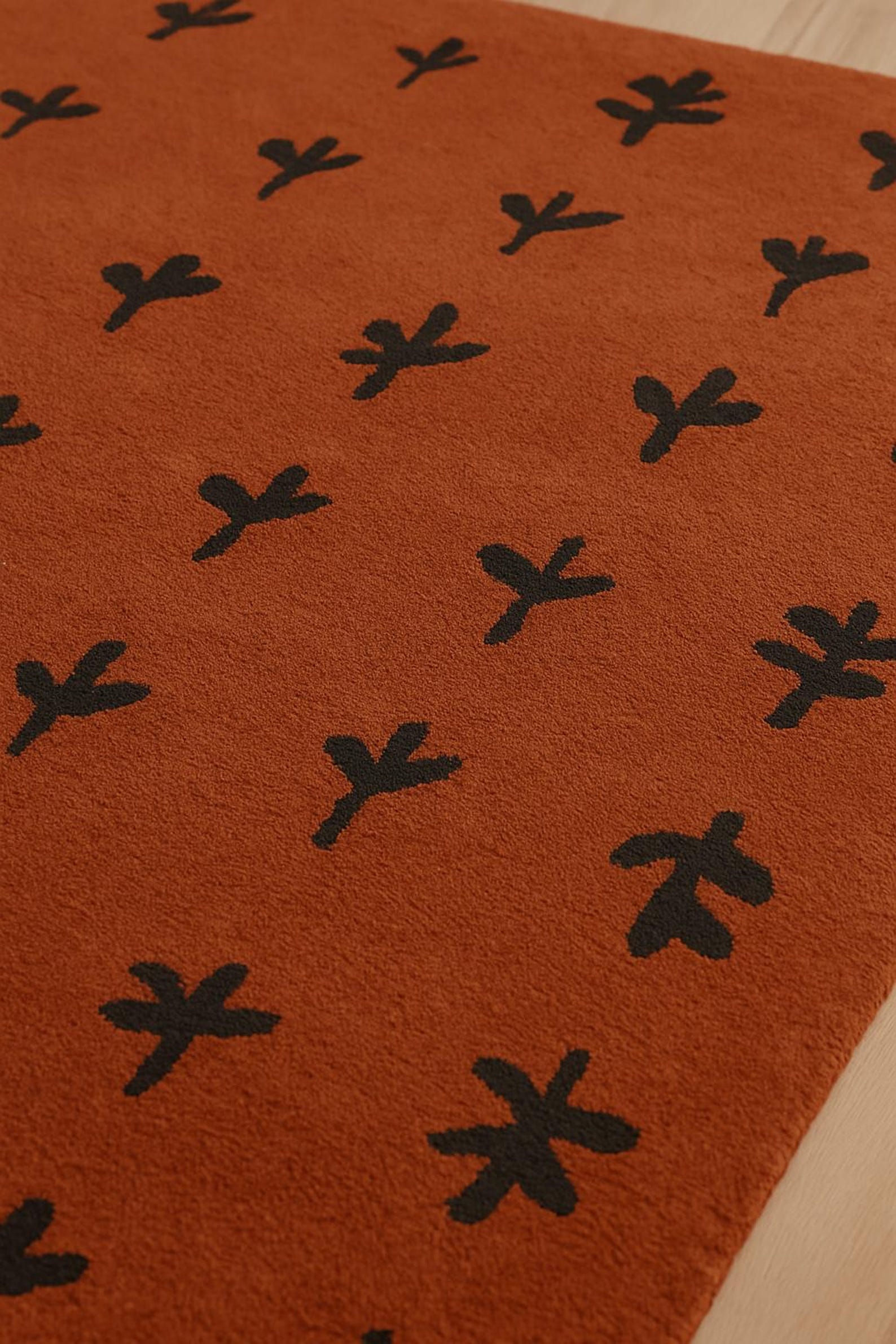 This rug is a contemporary statement piece that blends bold color with artistic design. The burnt orange background creates warmth and vibrancy, while the dark blue abstract leaf patterns add depth and contrast. The central grid of evenly spaced motifs gives it a structured, modern appeal, while the larger, more intricate leaf designs along the border introduce a touch of organic elegance. Perfect for living rooms, creative studios, or modern interiors, this rug not only enhances the aesthetic of a space but also serves as a conversation starter. Its stylized botanical theme bridges nature and artistry, making it ideal for those who appreciate unique, eye-catching home décor.